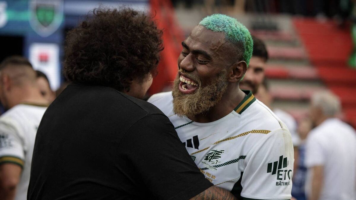 PROMOTION: Montauban's Fijian wing Josua Vici Celebrates after winning the French Pro D2 final against Grenoble last weekend at the Stade Ernest Wallon Stadium in Toulouse. Pic: Valentine Chapuis, Getty Images.