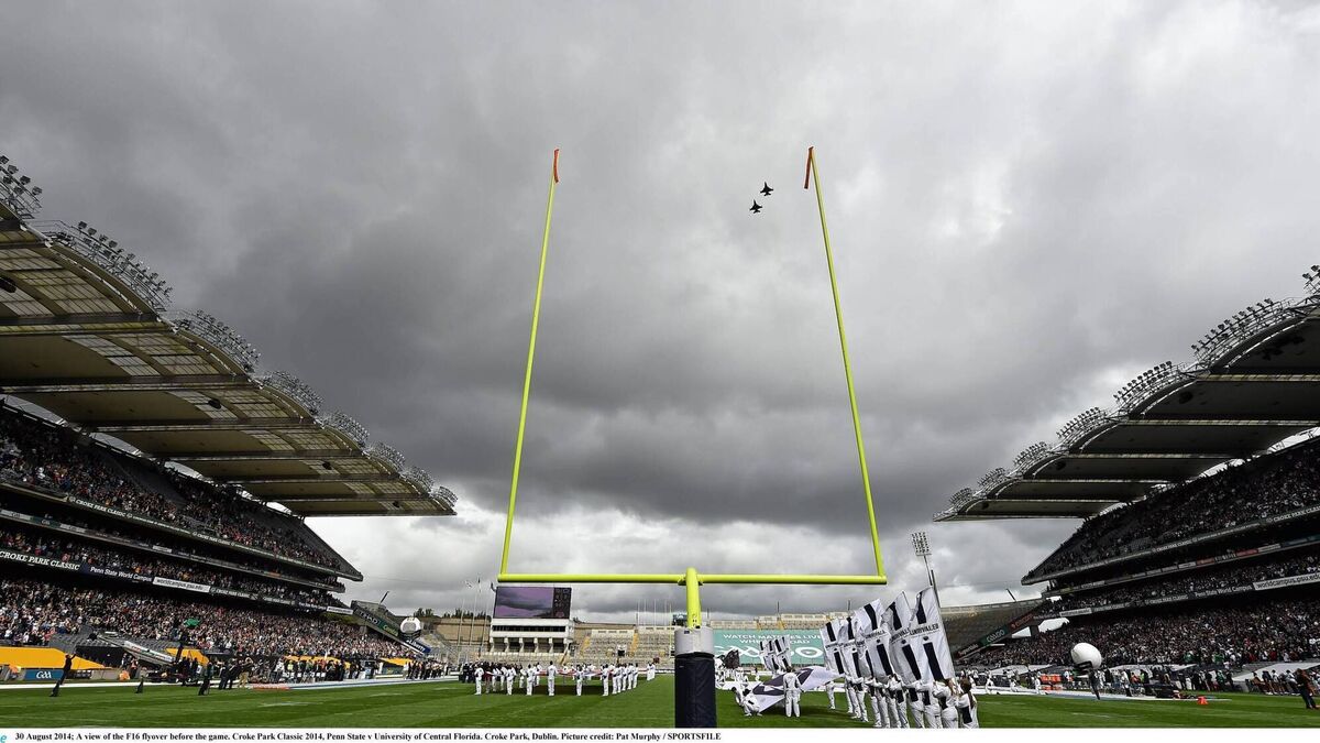FLY OVER: A view of the F16 flyover before the game. Croke Park Classic 2014, Penn State v University of Central Florida in Croke Park. Pic: Pat Murphy / SPORTSFILE