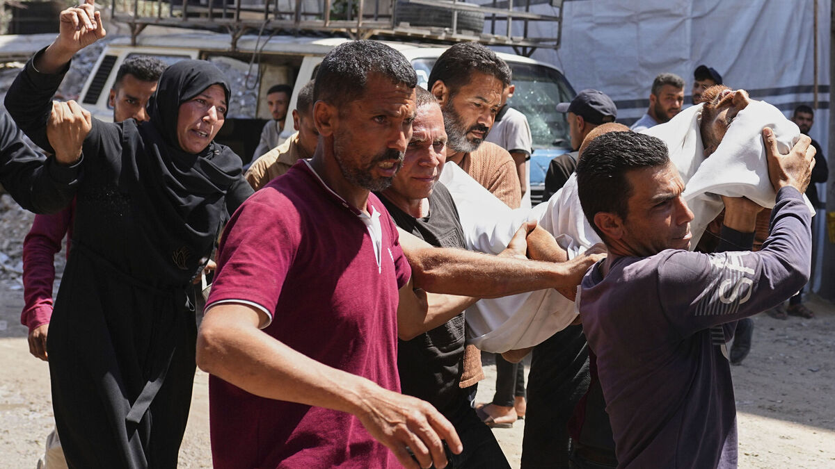 Palestinians carry the body of a man killed in an Israeli military strike on Gaza, for his funeral at Al-Shifa Hospital in Gaza City, Thursday, June 19, 2025. (AP Photo/Jehad Alshrafi)
